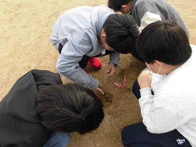 くぎ抜きを使うのですが、真上に引っ張るとなかなか抜けません。すると、何人かの子が上手にてこの原理を使って、簡単に杭を抜けることに気が付きました。これから、身の回りのてこの原理についてさらに追究していきます。