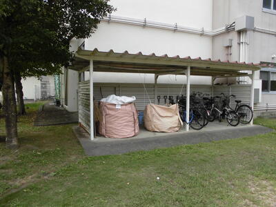 学校の門を入っていただき、校舎横の自転車小屋に、アルミ缶の回収袋を設置しています。