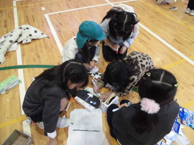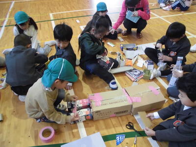 今日は、空き箱などを使って、ロープをするすると滑るおもちゃを作りました。グループごとに、かに・たこ・ユニコーン・恐竜など滑らせたいものを考え、どうしたらよく滑るかを考えました。