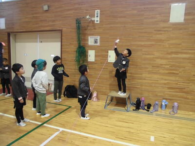 実際に滑らせてみると、なかなか思うようには滑りません。「バランスが悪いかな。」「ロープをもう少し引っ張ってみようかな。」「クリップを2つつけようかな。」等など、みんなで相談しながら活動しました。