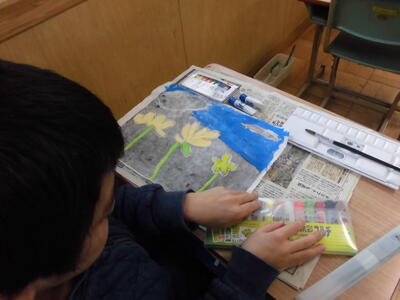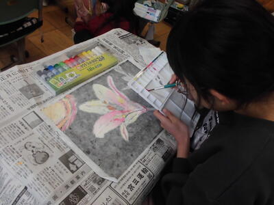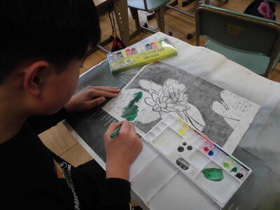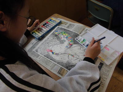 3月6日(金)5年生の木版画が刷り上がり、絵の具で色を付けています。