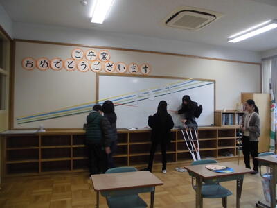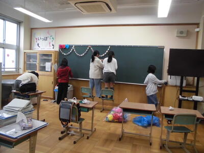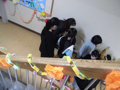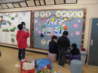 6年生のために 投稿: 学校管理者 (03/18) 3月18日(水)、明日の卒業式に向けて、4・5年生が式場準備や、教室などの飾りつけを行いました。 6年生に喜んでもらいたいと、今まで一生懸命に飾りを作って準備をしてきました。 明日は卒業式。みんなの心に残る式になりますように・・・ Tweet -